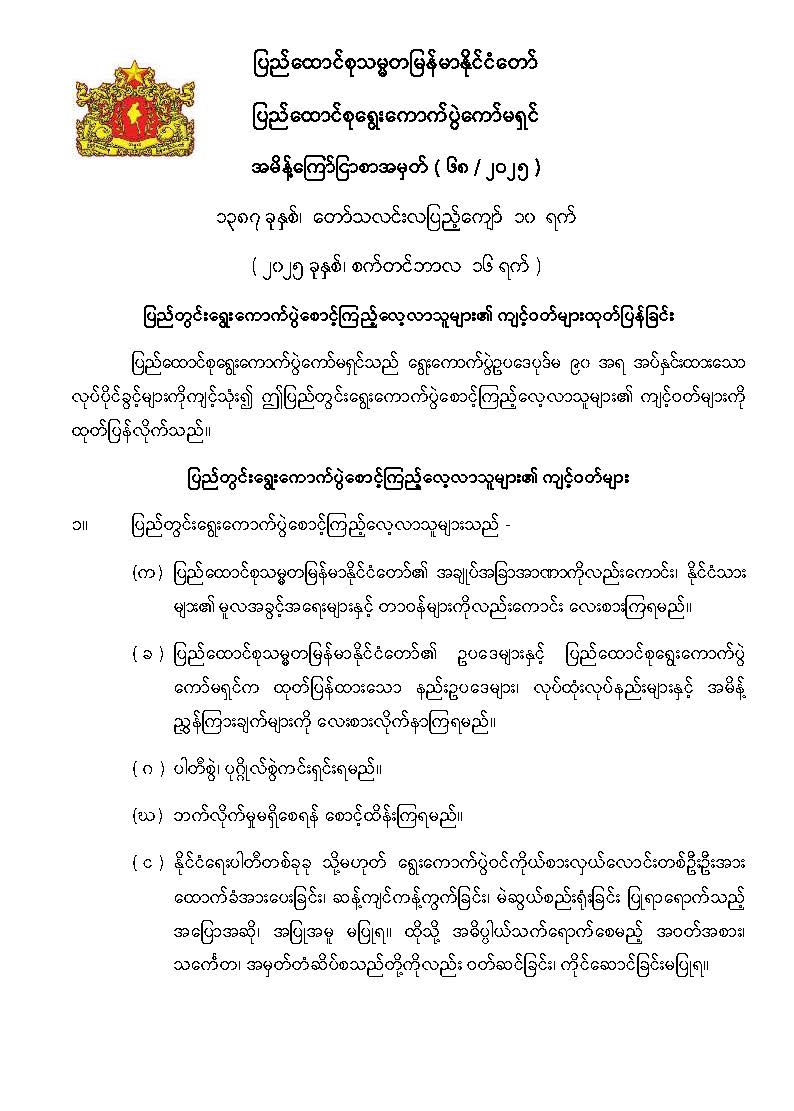 ပြည်တွင်းရွေးကောက်ပွဲစောင့်ကြည့်လေ့လာသူများ ဆောင်ရွက်ရမည့်လုပ်ငန်းစဉ်များထုတ်ပြန်ခြင်း |