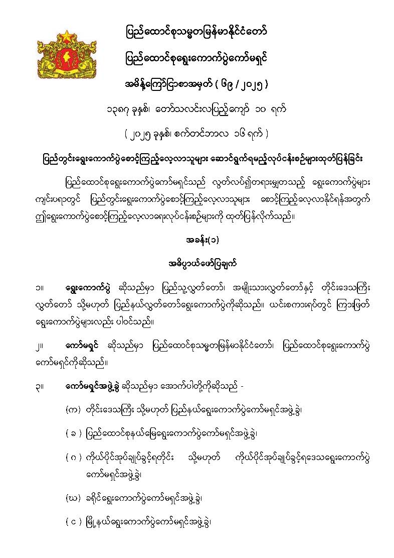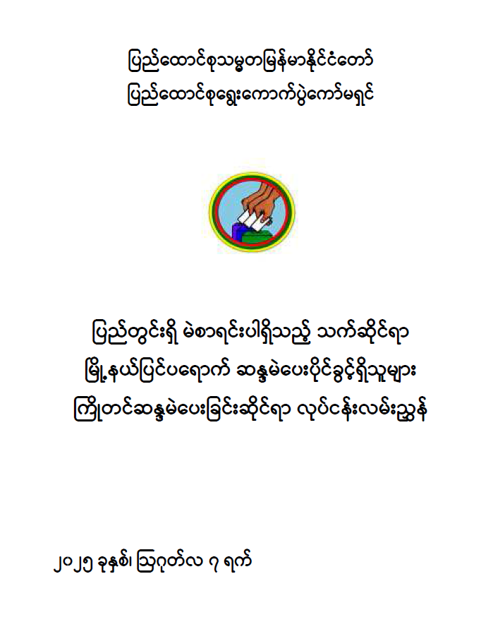 (၂၀၂၅ ခုနှစ်၊ ဩဂုတ်လ ၇ ရက်နေ့အထိ ပြင်ဆင်ထားသည့် လွှတ်တော်ရွေးကောက်ပွဲနည်းဥပဒေများနှင့်အညီ ပြင်ဆင်ရေးသား၍ ပြန်လည်ပုံနှိပ်သည်။) |