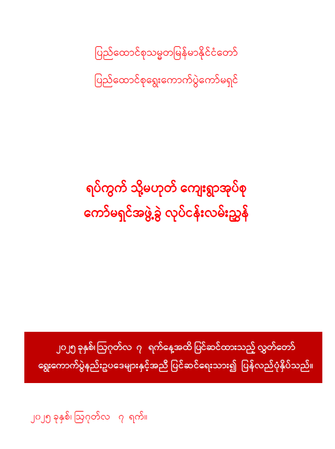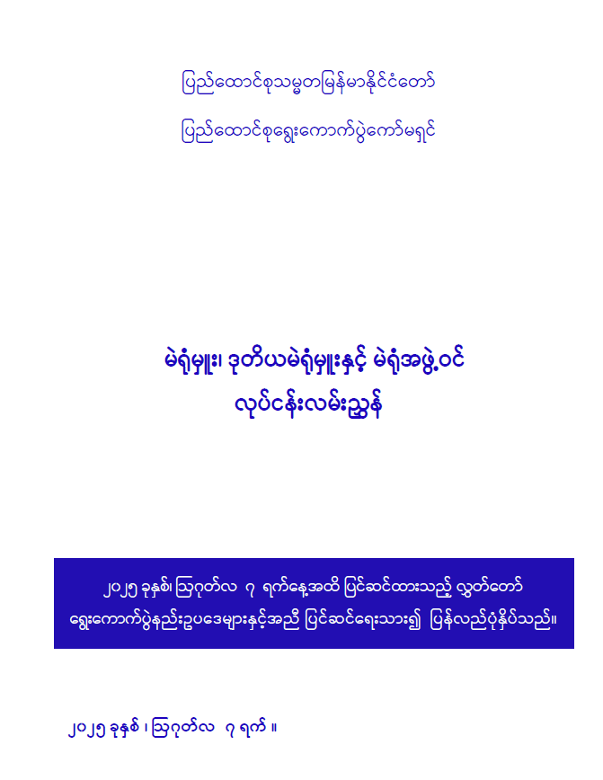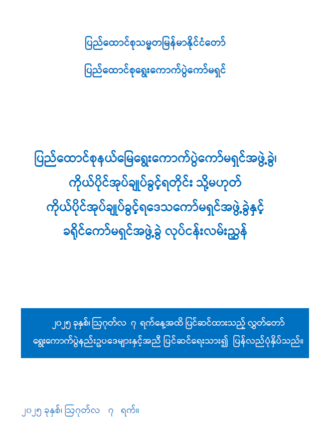 ရပ်ကွက်နှင့်ကျေးရွာအုပ်စု ရွေးကောက်ပွဲကော်မရှင်အဖွဲ့ခွဲ လုပ်ငန်းလမ်းညွှန် (၂၀၂၅ ခုနှစ်၊ ဩဂုတ်လ ၇ ရက်နေ့အထိ ပြင်ဆင်ထားသည့် လွှတ်တော်ရွေးကောက်ပွဲနည်းဥပဒေများနှင့်အညီ ပြင်ဆင်ရေးသား၍ ပြန်လည်ပုံနှိပ်သည်။) |