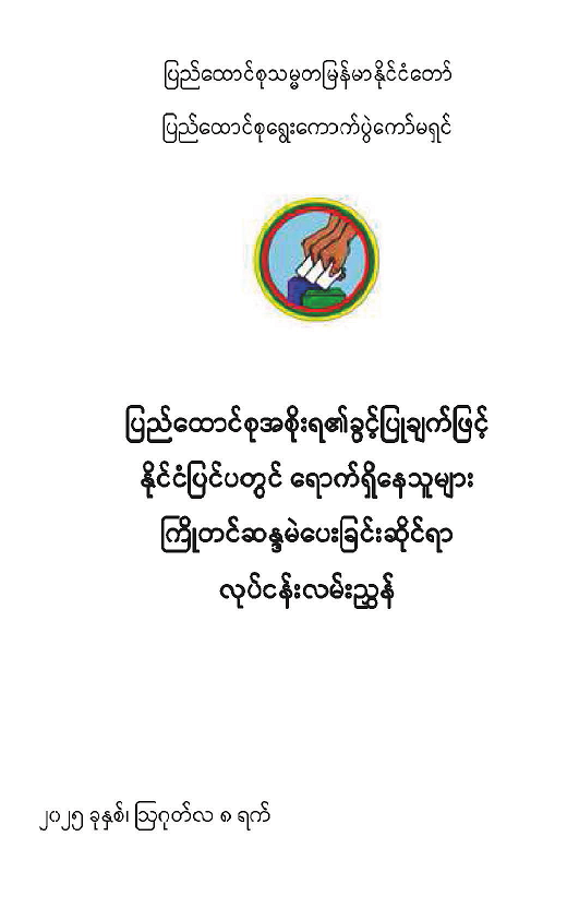 မဲရုံမှူး၊ ဒုတိယမဲရုံမှူးနှင့် မဲရုံအဖွဲ့ဝင် လုပ်ငန်းလမ်းညွှန် (၂၀၂၅ ခုနှစ်၊ ဩဂုတ်လ ၇ ရက်နေ့အထိ ပြင်ဆင်ထားသည့် လွှတ်တော်ရွေးကောက်ပွဲနည်းဥပဒေများနှင့်အညီ ပြင်ဆင်ရေးသား၍ ပြန်လည်ပုံနှိပ်သည်။) |