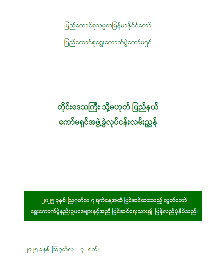 တိုင်းဒေသကြီး သို့မဟုတ် ပြည်နယ် ရွေးကောက်ပွဲကော်မရှင်အဖွဲ့ခွဲ လုပ်ငန်းလမ်းညွှန် (၂၀၂၅ ခုနှစ်၊ ဩဂုတ်လ ၇ ရက်နေ့အထိ ပြင်ဆင်ထားသည့် လွှတ်တော်ရွေးကောက်ပွဲနည်းဥပဒေများနှင့်အညီ ပြင်ဆင်ရေးသား၍ ပြန်လည်ပုံနှိပ်သည်။) |